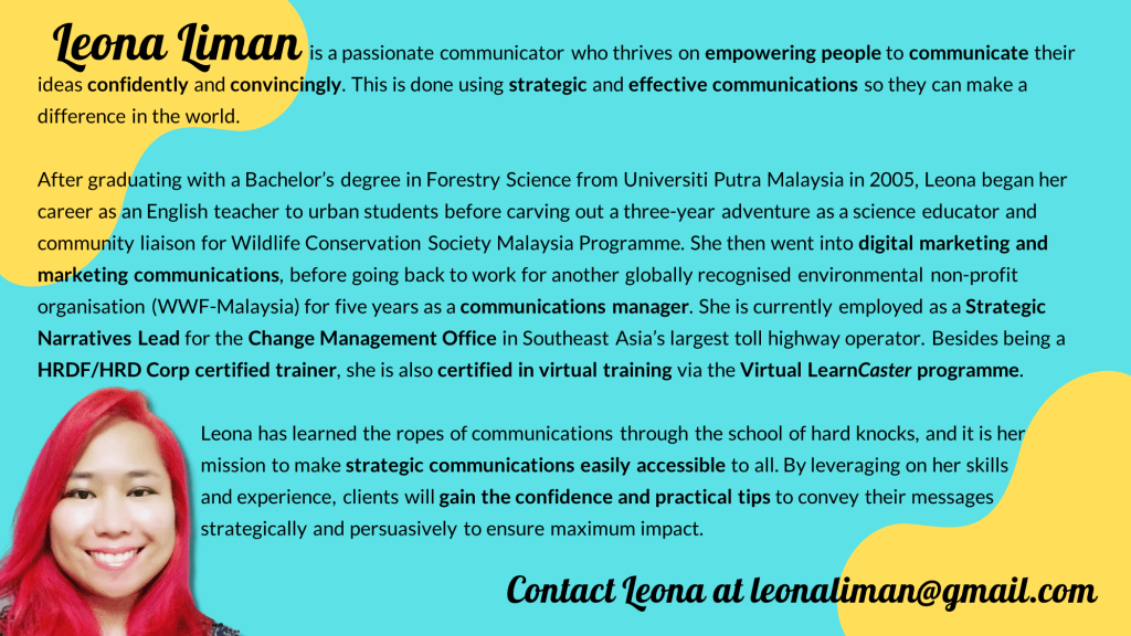 As a HRD Corp trainer, I empower leaders and teams to excel in change communications, crisis management, and media relations, equipping them with the skills to navigate today’s dynamic communications landscape. Armed with skills honed through leadership roles and a deep commitment to mentoring, I deliver results that resonate and inspire my target audiences.