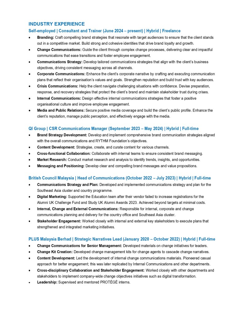 Documents: Editing, proofreading, translation (English to Malay/Malay to English), writing· Internal communications: Letter from the CEO, newsletter, memo